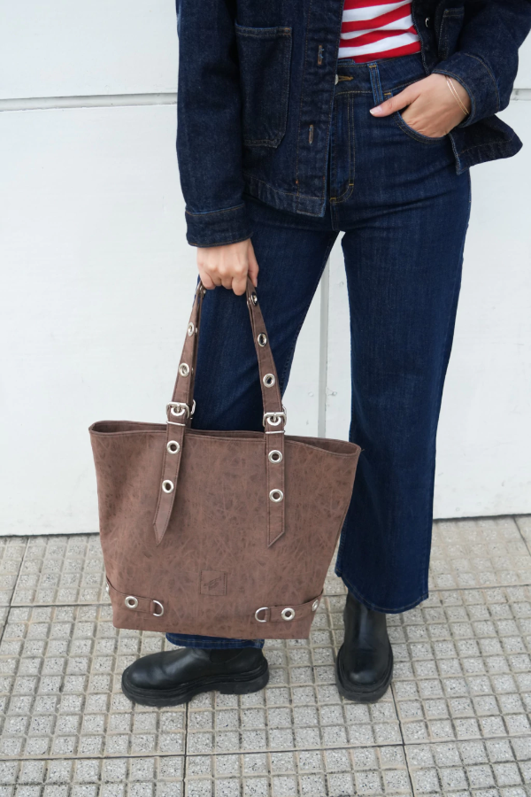 Nuestro Tote Bag Arizona está confeccionado en sintético marrón gastado. Manijas diseñadas con ojales en niquel y regulables con hebilla. Apertura con cierre ykk a tono y forreria en gross negro. En el interior posee bolsillo con cierre.