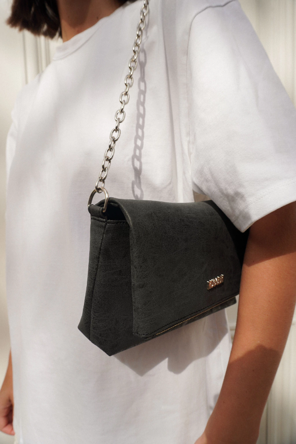 La Bandolera Mini Buenos Aires está confeccionada en cuero sintético negro gastado con cierre metálico ykk a tono.