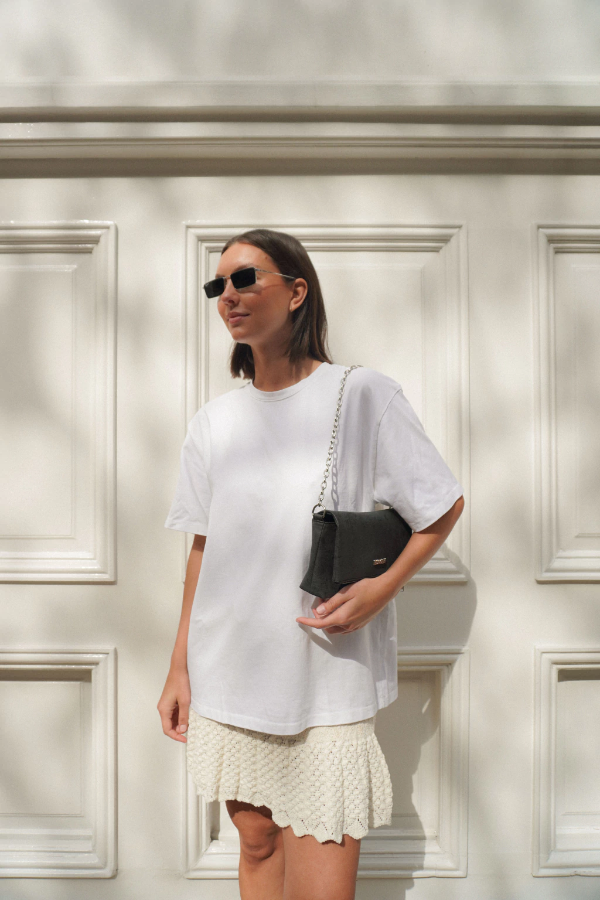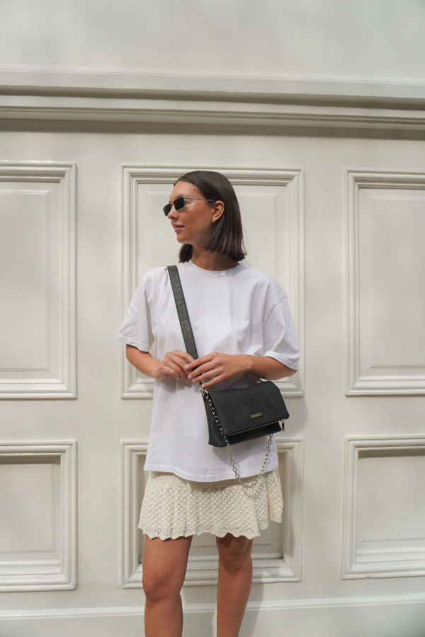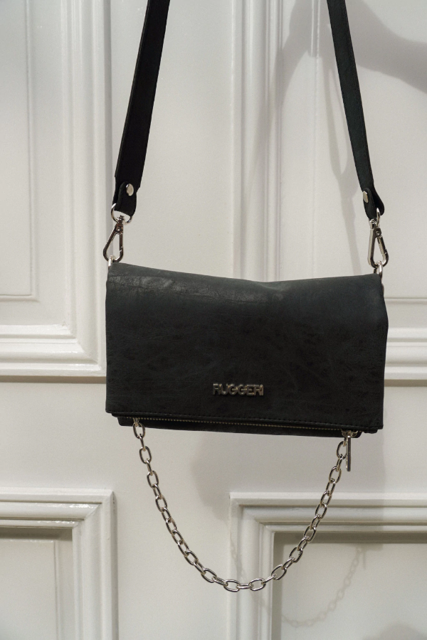 Cuenta con correa regulable y desmontable, e inlcuye cadena para usar tipo shoulder bag.