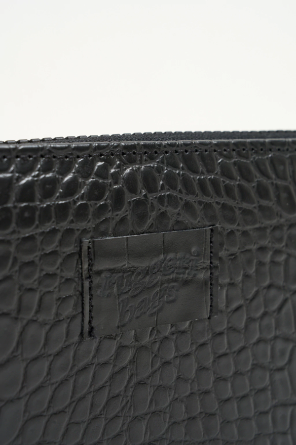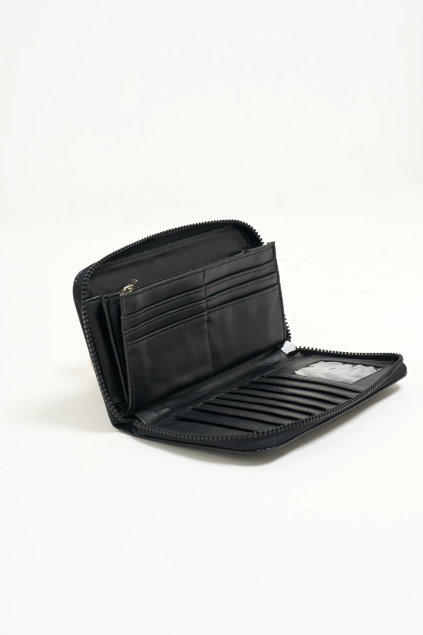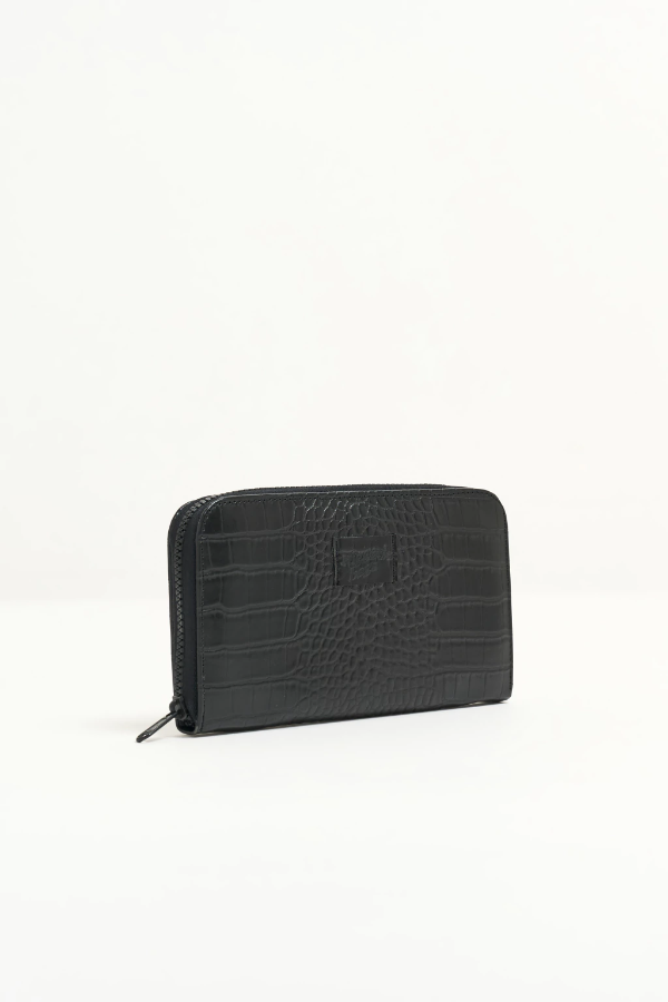 Nuestra billetera CORAL, está confeccionada en cuero sintético croco negro. Apertura con cierre diente de perro negro. Interior con espacio para 12 tarjetas, doble división para billetes y monedero con cierre.