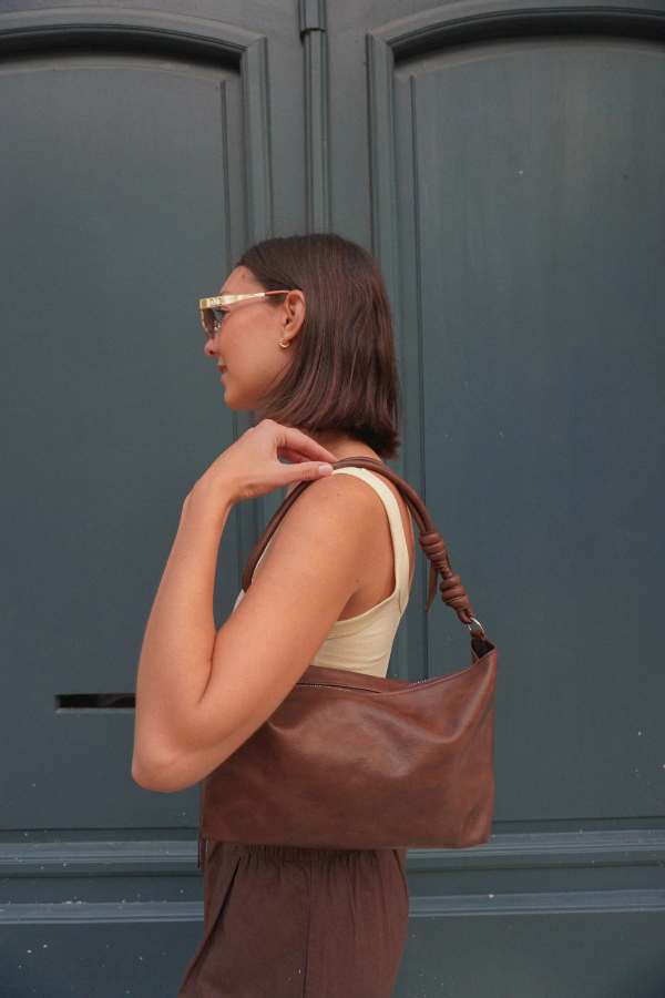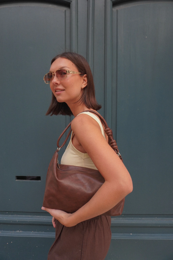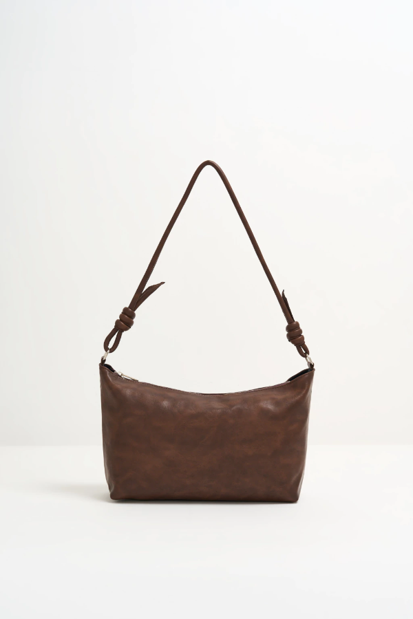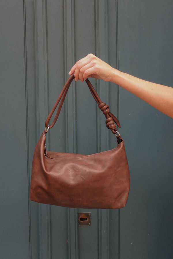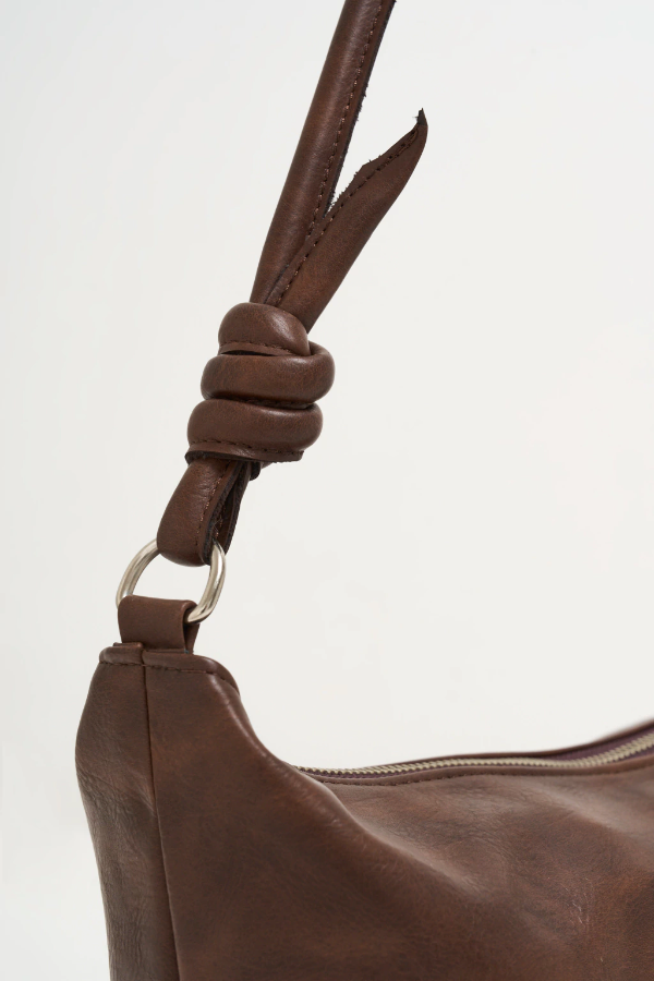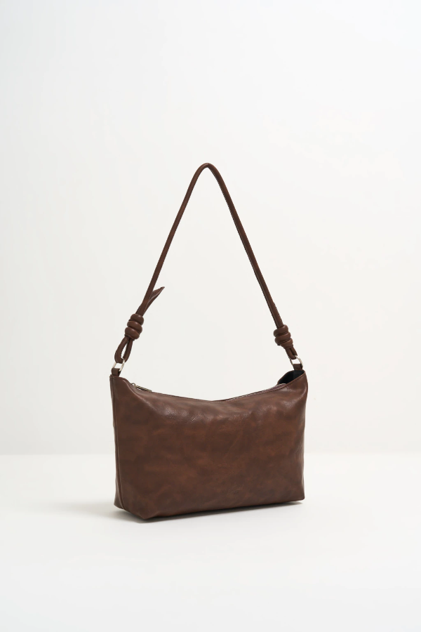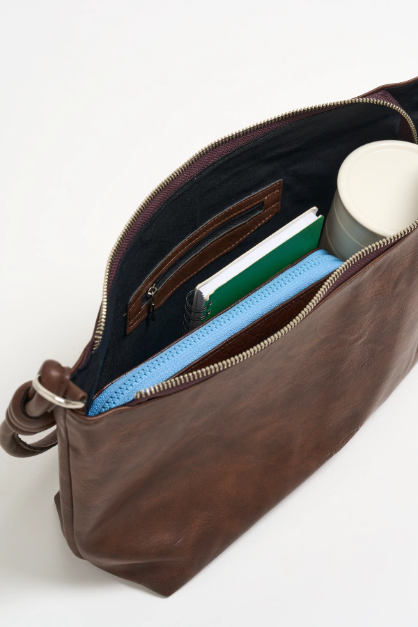 Cartera confeccionada en cuero sintético chocolate. Posee correas redondeadas con nuditos regulable, para que uses cruzada o al hombro. Apertura con cierre ykk metálico e interior con bolsillo y cierre.